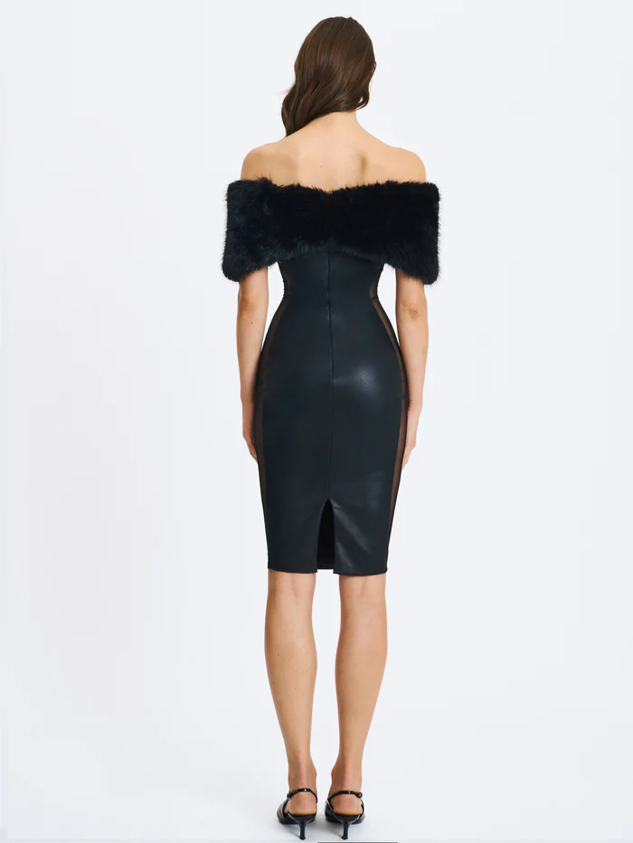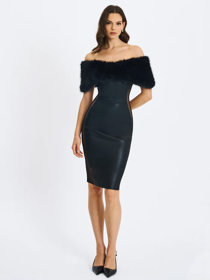 The Bellis Dress is your go-to for nights when subtle just won’t cut it. This off-shoulder black midi is framed with a thick fur trim that drapes dramatically across the neckline, giving instant old-Hollywood energy. Curve-hugging vegan leather front and back panels sculpt the body, while sheer mesh side panels add just the right amount of daring. A slight V-neckline flatters the silhouette, and an invisible back zipper keeps everything sleek. Fully lined in satin for a touch of hidden indulgence, this dress is perfect for moody date nights, cocktail lounges with low lighting, or fall parties where all eyes should absolutely be on you.