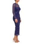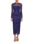 The Zoey Dress is an elegant, modern midi designed to flatter with effortless sophistication. Crafted in a sheer mesh overlay with a refined dotted pattern, this long-sleeve silhouette features a fitted bodice and streamlined skirt that gently skims the body. The semi-sheer neckline and sleeves add a subtle touch of allure while maintaining a timeless, polished feel. Finished at a chic midi length, this dress transitions seamlessly from daytime events to evening occasions with just a change of accessories.