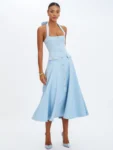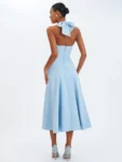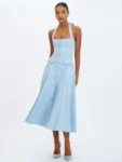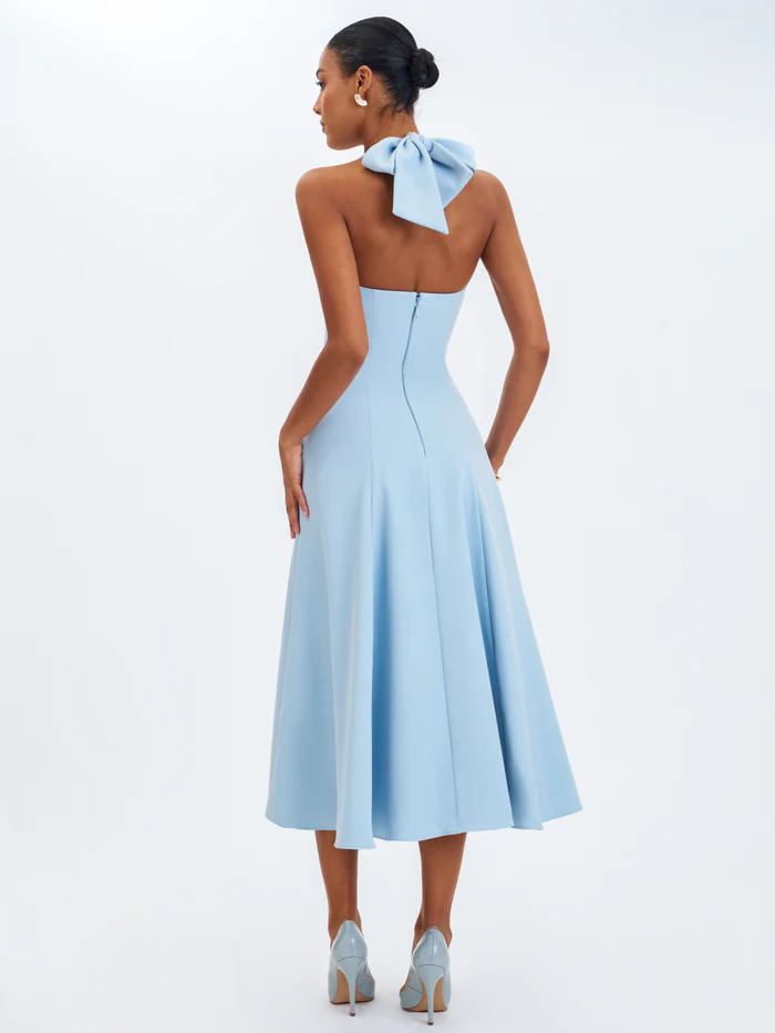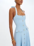 Refined with a soft, modern charm, the Gillian Dress is an elegant choice for spring occasions. Designed in a delicate mist blue hue, this halter-neck midi features a graceful square neckline and princess seams that sculpt the body for a flattering, tailored fit. A decorative front placket with gold buttons and matching pocket flaps adds a polished, elevated touch, while the halter tie at the back of the neck finishes in a feminine bow. Fully lined in smooth satin and completed with an invisible back zipper for a seamless look, the Gillian Dress is perfect for spring luncheons, daytime events, garden parties, and polished evenings where effortless sophistication takes center stage.