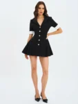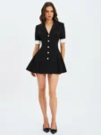 Polished, playful, and unapologetically powerful—the Ilitha Dress is your shortcut to office-chic perfection. Crafted from a woven stretch crepe for a sleek, structured fit, it features sculpted shoulders, smooth lapels, and a flattering A-line mini skirt with side pleats that flare out from the hips for subtle drama. Luxe gold buttons accent the front, while crisp white overlapping cuffs add a sharp, tailored finish to the short sleeves. Fully lined in satin for a soft, comfortable feel, it’s finished with a discreet back zipper for a seamless look. From boardroom bold to after-hours allure, this dress keeps up with every move.