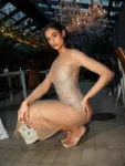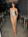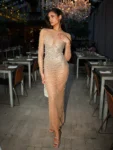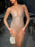 Introducing the Isabel dress, a striking ensemble designed for ultimate elegance and allure. Made from high-stretch mesh fabric, this dress offers both comfort and a flattering fit. The long sleeves are adorned with sparkling rhinestone decorations, adding a touch of glamour. An invisible zipper at the back ensures a seamless look, while the high slit at the center back adds a daring and sophisticated element. Perfect for any special occasion, this dress effortlessly combines modern style with timeless grace.