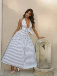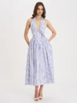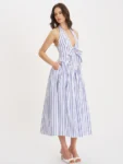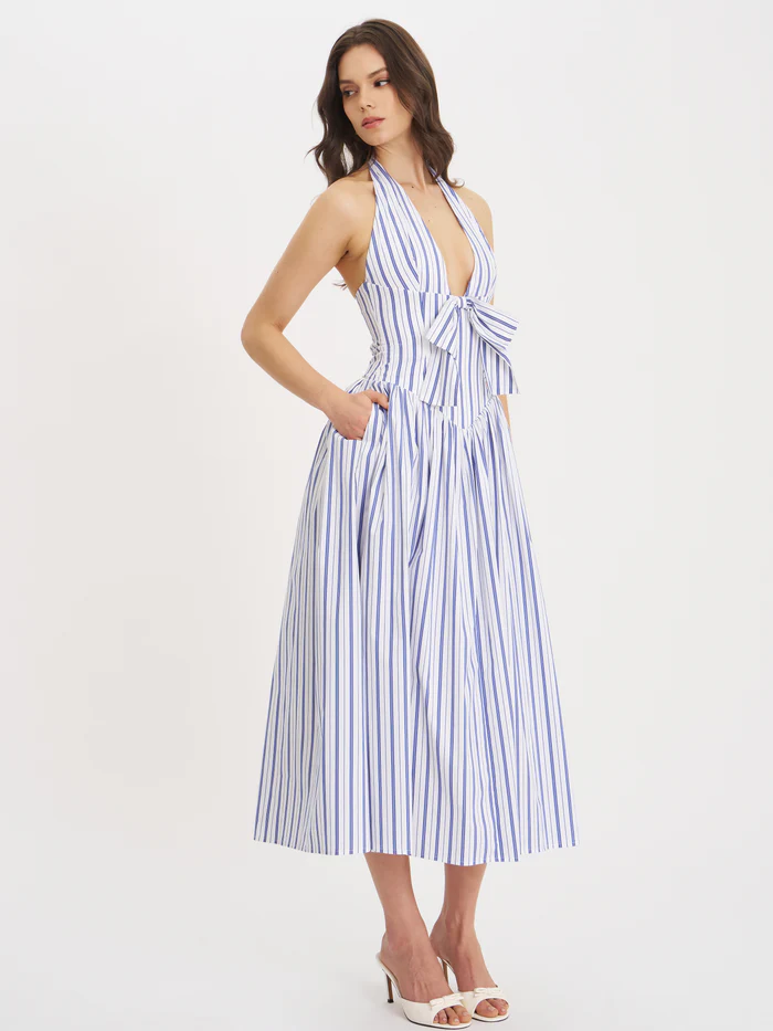 Breeze through your holiday in effortless elegance with the Mackenna Dress. Designed in a classic navy beach-style stripe, this maxi dress channels relaxed vacation vibes with a polished twist. The halter neckline adds a touch of sophistication, while the smocked back and invisible zipper ensure a comfortable and flattering fit. A drop waist flows into a graceful silhouette, complete with invisible pockets for added functionality. Whether you’re strolling along the coast or dining under the stars, the Mackenna Dress is your go-to piece for vacation-ready style.