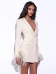This classic Miss Circle blazer dress combines sophistication with playful details. Featuring a sexy low “V” neckline and our signature double-breasted fit with pockets, the mini length and long sleeves are adorned with a chic feather trim. The side thigh cutout adds an extra element of allure with feather trim on the slit edge. Internal silver snap closures down the center front ensure a fitted look. Fully lined and made of luxurious woven stretch crepe fabric with feather trimming details, this dress is versatile for work or any special occasion you want to turn heads at. The Madeline dress offers a timeless and fashionable choice for your next event.