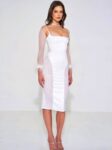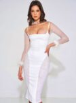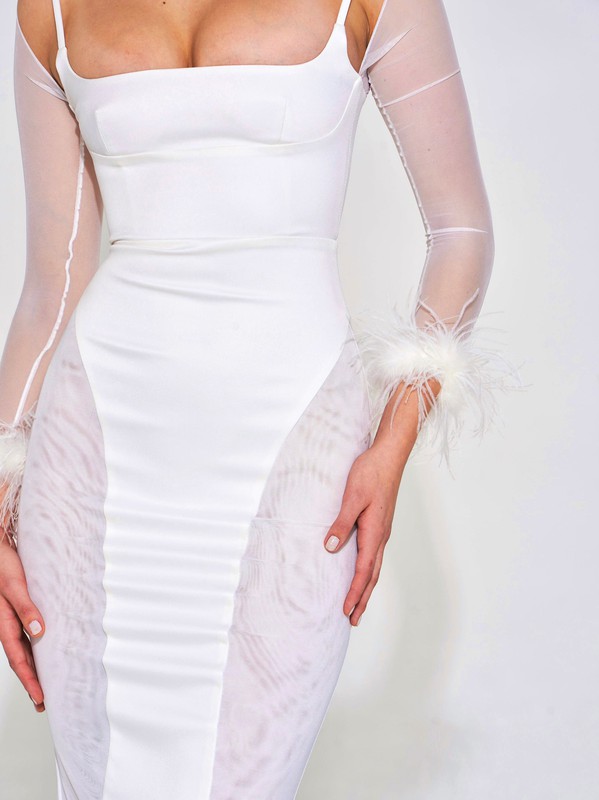 Be the first to review “Oaklie Satin Mesh Sleeve Dress With Feather – White”