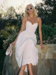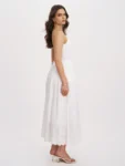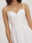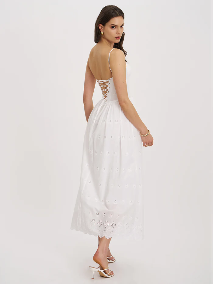 Breezy and romantic, the Oberon Dress is your perfect go-to for summer escapes and everyday charm. Crafted from airy white cotton eyelet, this dress features delicately trimmed cups and laced edges that highlight its feminine allure. The adjustable straps and lace-up back offer a customizable, flattering fit, while the high waistline elongates the silhouette. Fully lined for comfort and coverage, the Oberon Dress is ideal for vacations, picnics, or simply enjoying sunny days in effortless style.