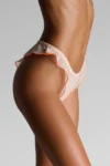 Tanga in pastel-colored chiffon, trimmed with fluorescent accents. A distinctly feminine French cut, elasticated at the waist and delicately high-cut with airy ruffles, elongates the legs and gracefully reveals the hips. No cotton lining for complete transparency.