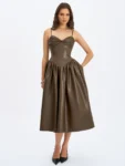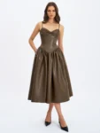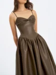 The Parisia Dress brings cocoa vibes to life in buttery-soft vegan leather. With a ruched bust, padded cups, and delicate spaghetti straps, it’s equal parts sultry and sculpted. Princess seams and a cinched waist flow into a drop-waist silhouette, cascading into a gathered A-line maxi skirt for that slow-motion entrance moment. Fully lined in satin and finished with an invisible back zipper, this dress is your go-to for rooftop date nights, gallery soirées, or any evening that deserves a bold statement in a cruelty-free package.
