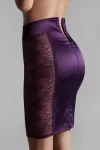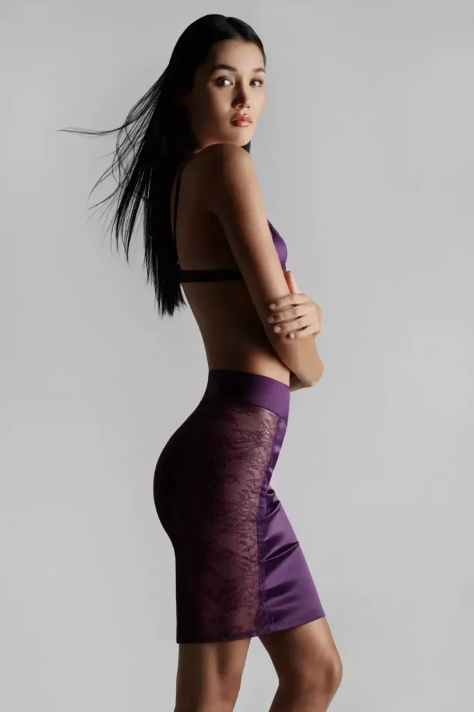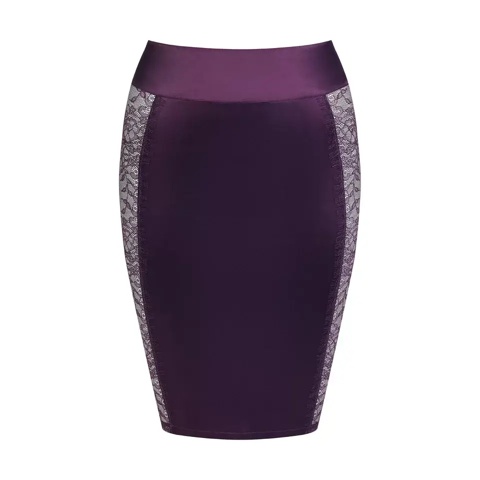 Satin and fine floral lace pencil skirt. A signature piece from the Villa Satine collection crafted from satin embellished by two lace strips on the sides to accentuate the figure. Two-way fastening via a tone-on-tone zip on the back. Waistband made from a large satin band to show off the waist. This fitted skirt can be worn as day or evening wear.