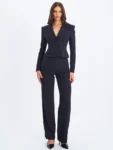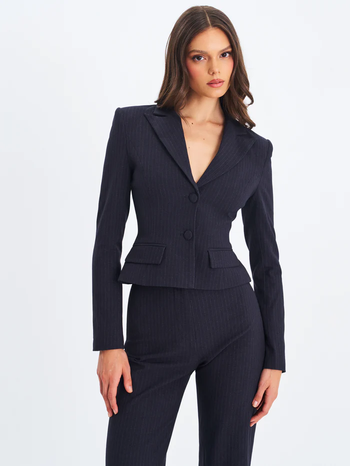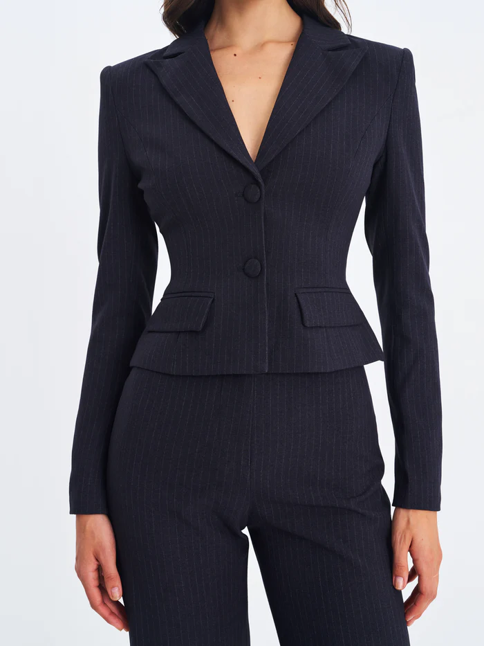 The Quinne Blazer is your go-to for when you want to look like the boss and the muse. This double-button, long-sleeve piece features sharp shoulder pads and a crisp notched lapel that mean business without sacrificing style. A flattering V neckline enhances the décolletage, while subtle princess seams and a tailored fit keep everything structured, sharp, and finished with a gentle flare at the waist for a refined feminine touch. Two decorative flap pockets add polish, while brushed navy crepe with delicate white stripes offers a soft contrast to its power-suit energy. Fully lined in satin, it’s ideal for big meetings, gallery openings, or any occasion that calls for confidence in a tailored package. Perfectly matches with our Quinne Pants.