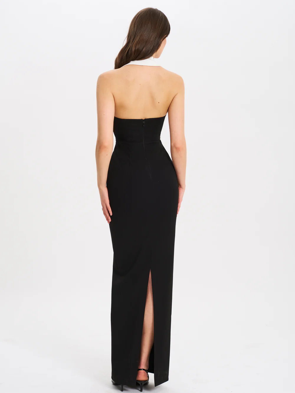 The Raelyn Dress blends business casual sophistication with a vintage-inspired charm, making it a timeless wardrobe essential. Designed in a classic black and white combo, this dress features a crisp white collar and an elegant halter neckline, exuding refined elegance. The high-waist design and slim fit silhouette enhance your curves, while the bodycon cut ensures a sleek and polished look. A back slit allows for effortless movement, and the invisible zipper provides a seamless finish. Whether for office wear or an upscale event, the Raelyn Dress is the perfect balance of power and poise.