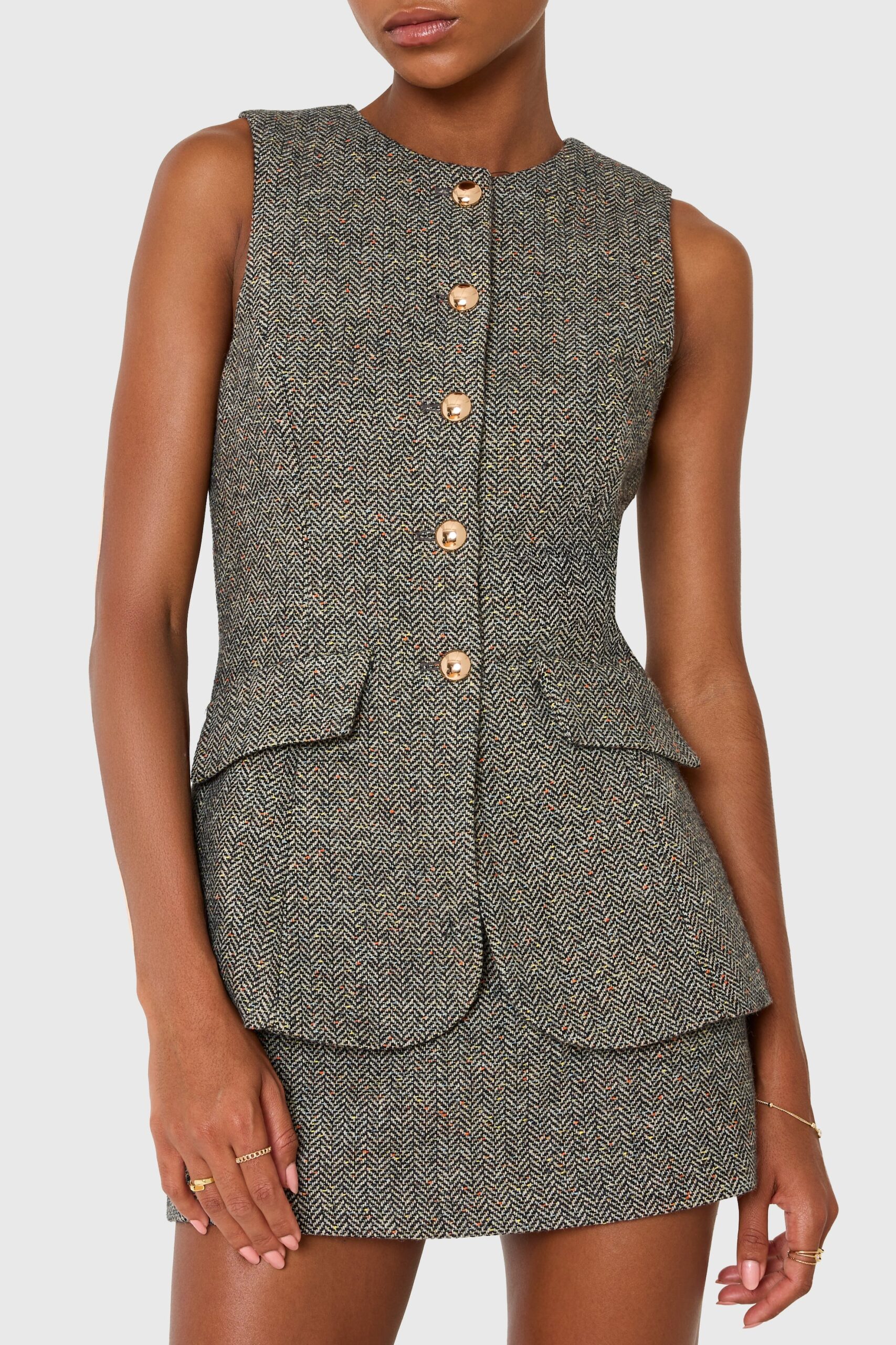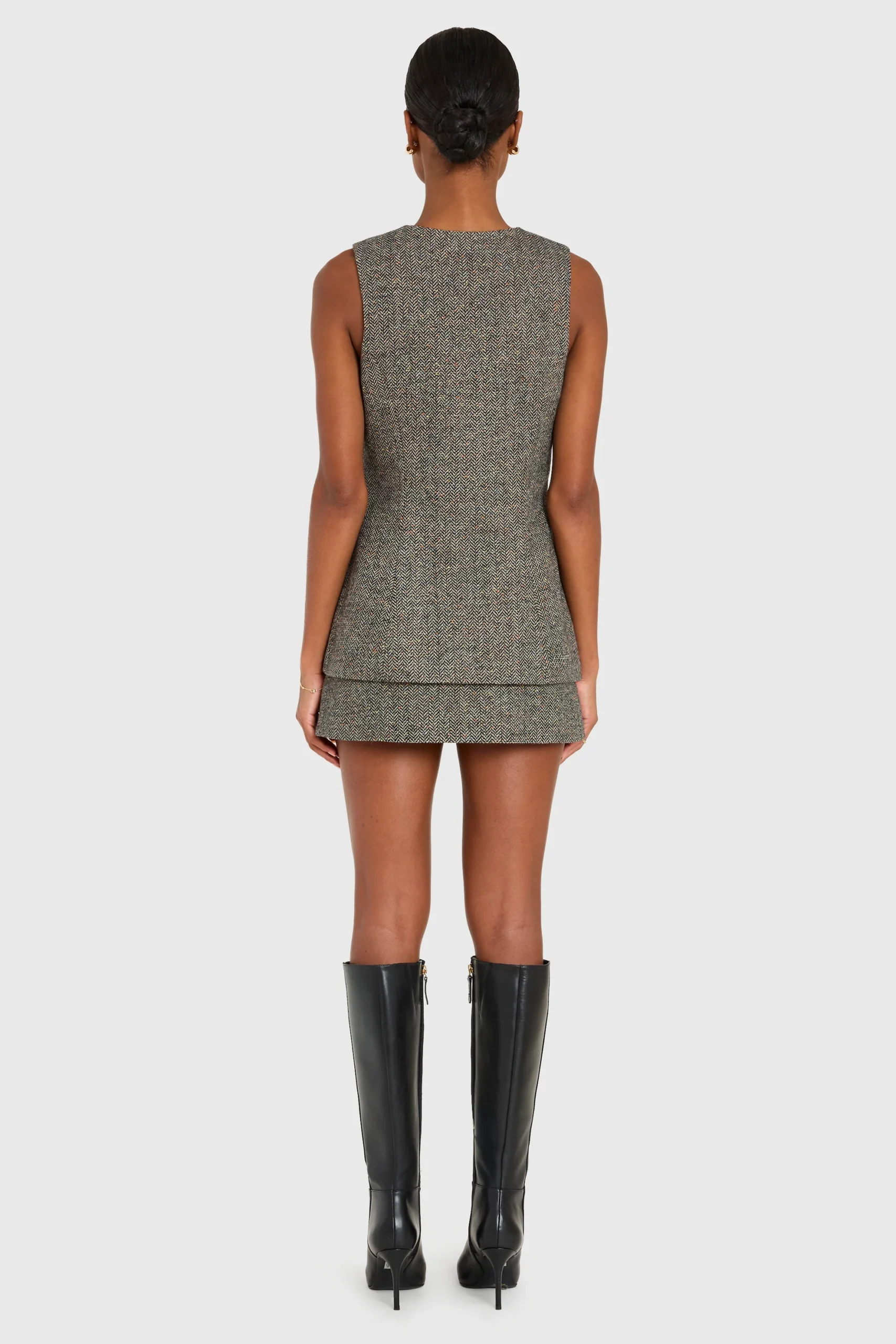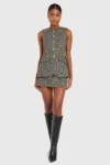 Show off your straight-A style in the Serena Romper. This tweed mini features vintage-inspired gold buttons, a high crew neck and a faux blazer hem detail. Pair with white tights for a school uniform-inspired look or layer a turtleneck underneath for a cool night out.