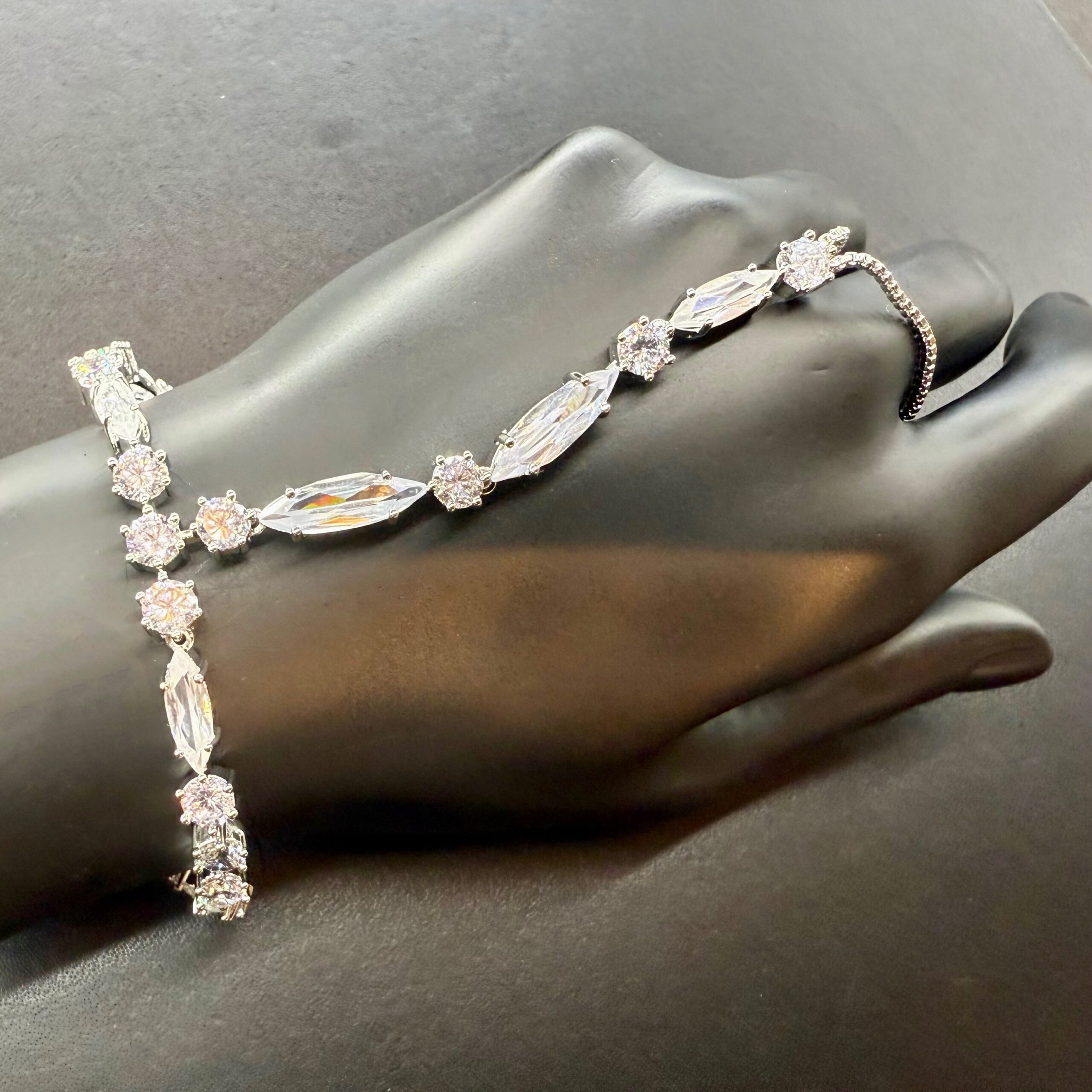 A statement of pure elegance — this crystal hand chain bracelet features a fluid line of marquise and round-cut stones that wrap the wrist in luminous sparkle. The delicate chain extension adds a touch of movement, making it perfect for evening glamour, special occasions, or elevating an everyday look with effortless shine.