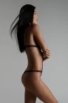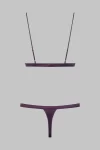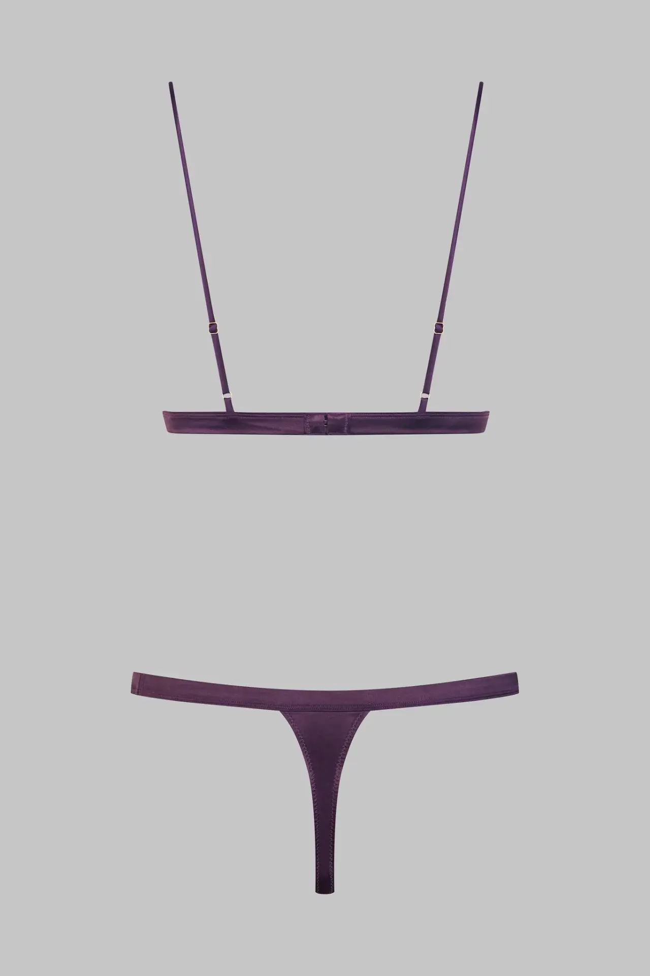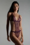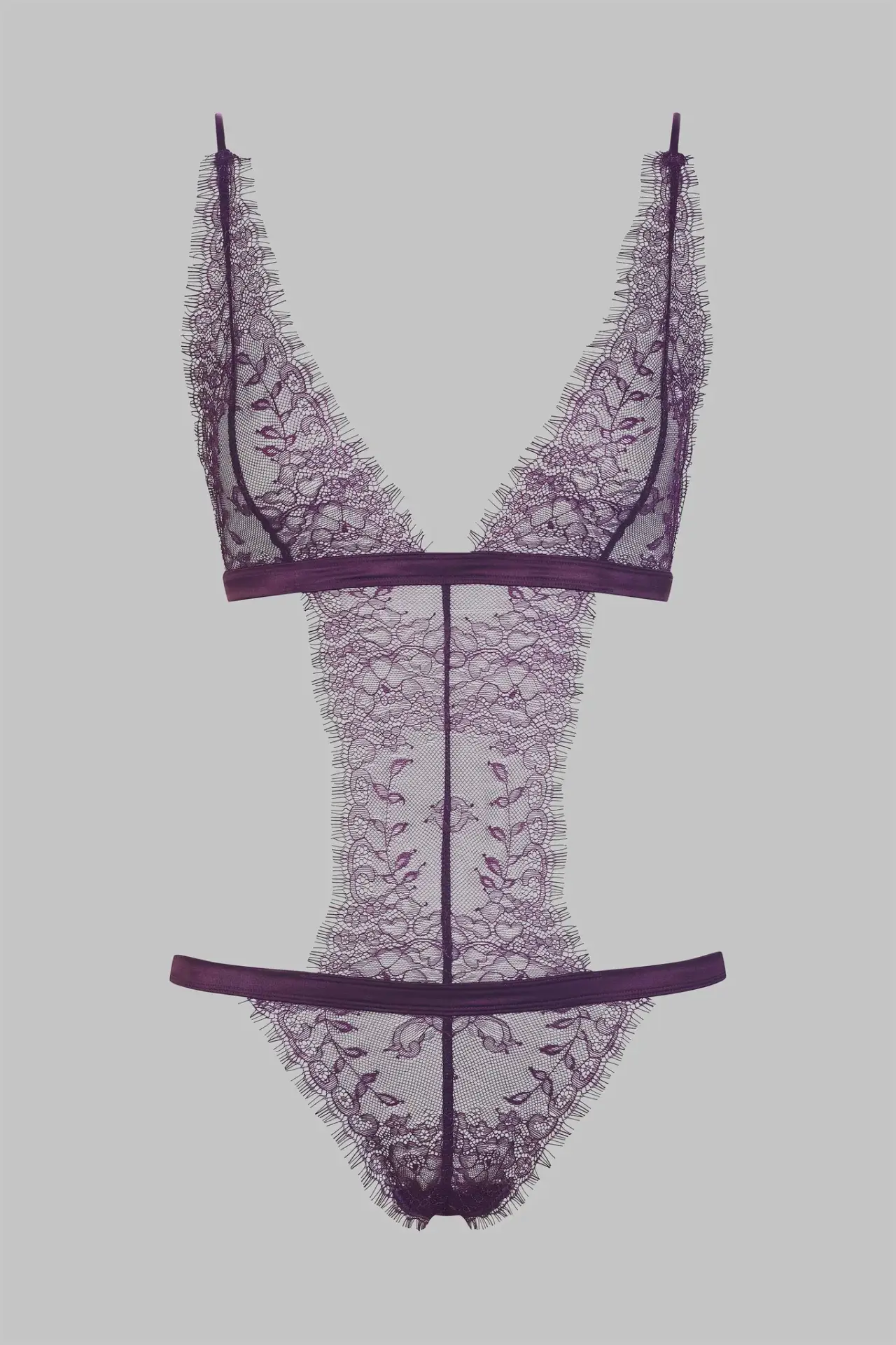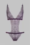 Satin and fine floral lace thong bodysuit. The design creates the illusion of a 2-piece outfit. There is a satin thong below and a lacy triangle bra without underwiring on top. Two satin-covered elasticated bands give this bodysuit support. Adjustable spaghetti straps and hook-and-eye fastening on the back.