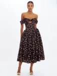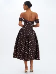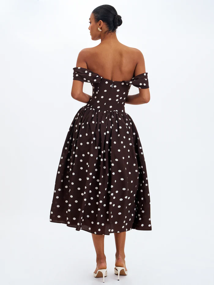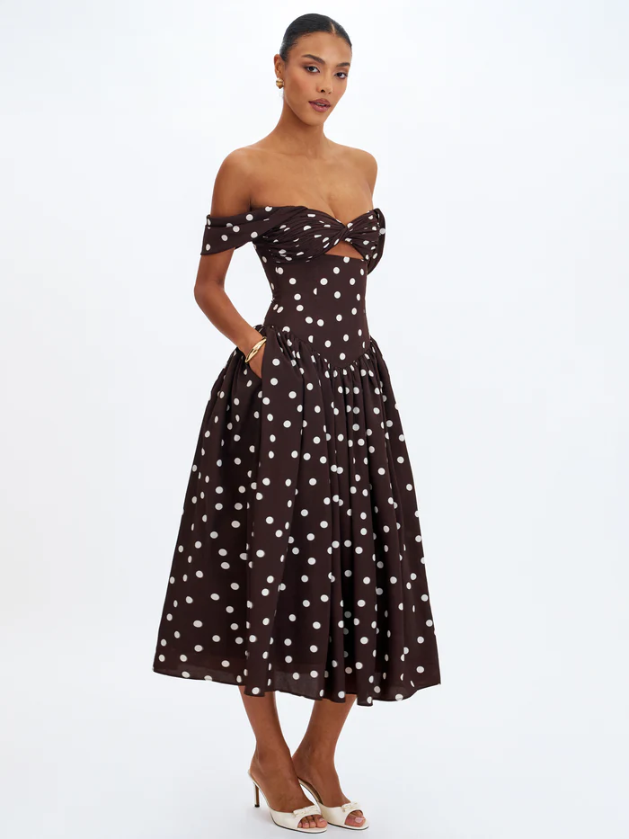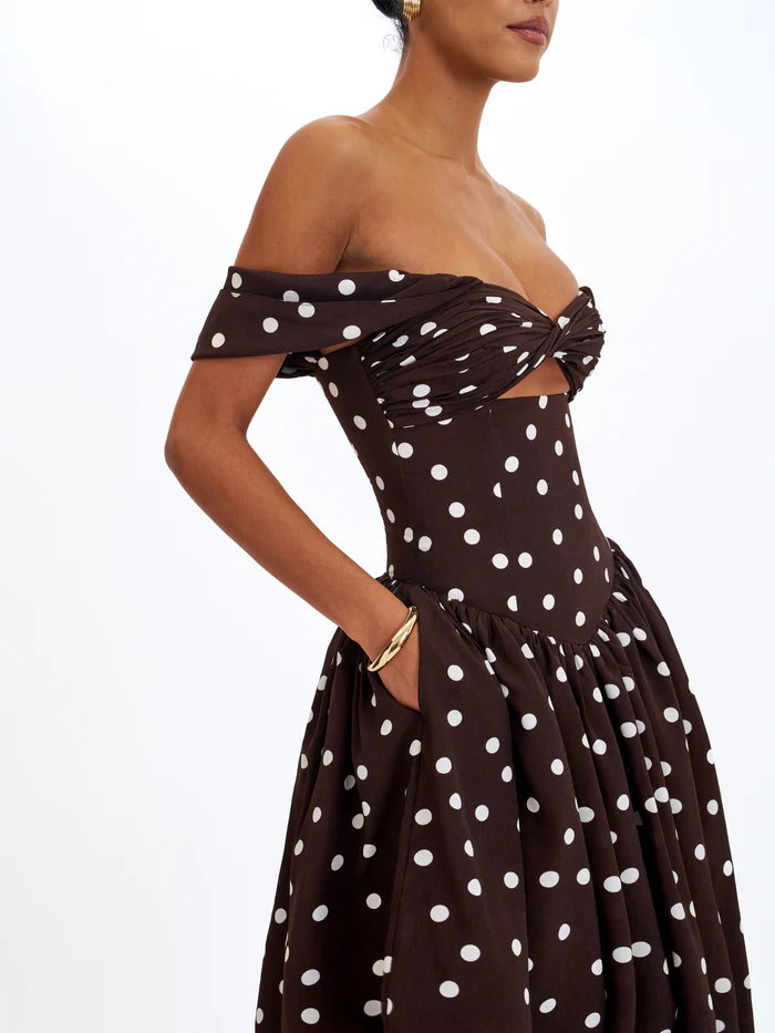 Softly romantic with a playful edge, the Xandie Dress is made for spring days that turn into unforgettable evenings. Designed with a rich mocha base and crisp white polka dots, this midi dress features elegant off-shoulder pleated detailing that frames the neckline beautifully. A twisted, pleated bust adds sculptural texture, while a subtle keyhole opening between the bust and waistline introduces a hint of allure. The dipped, drop-waist silhouette flows into a ruched A-line skirt for flattering movement and ease. Fully lined for comfort and finished with internal boning to support the bodice, the Xandie Dress is perfect for spring brunches, garden parties, daytime celebrations, and romantic dinners where effortless charm is the dress code.
