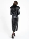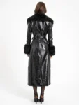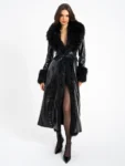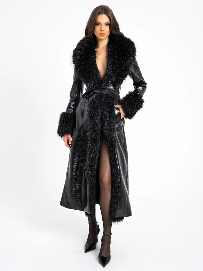Indulge in opulence with our high-quality A Black Fur Trim Vegan Croc Leather Coat. This stunning maxi coat exudes luxury, featuring puffy fur trim along the neckline and cuffs for a touch of dramatic elegance. Crafted from premium vegan croc leather and soft vegan fur, this coat is fully lined for ultimate comfort. Designed with belt loops and a sleek leather belt, it offers a flattering fit with effortless closure. Versatile and chic, it elevates any outfit with sophisticated glamour.